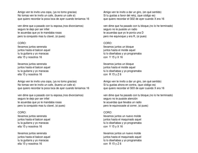 Amigo ven te invito una copa no ya no tomo no tomas bien te invito un cafe te quiero recordar la coca looooooca de ayer cuando teniamos 16. Y su longitud es más de 0312. Amigo ven te invito una copa.